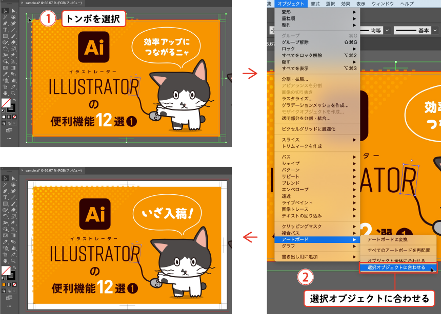 トンボを選択した状態で、オブジェクト>アートボード>選択オブジェクトに合わせるをクリック。