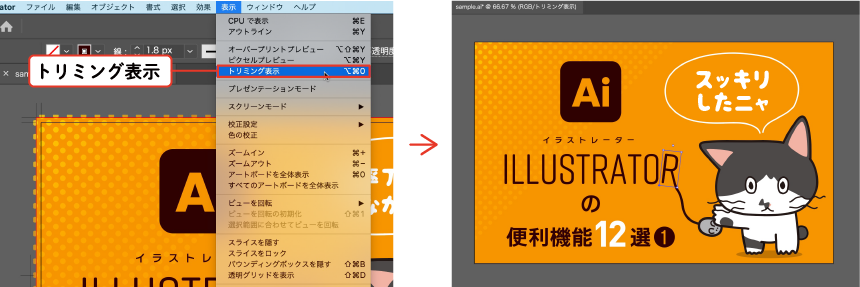 トリミング表示とは、アートワークの仕上がりイメージを瞬時に確認できるありがた〜いプレビュー機能(Illustrator CC 2019以降の機能)です。