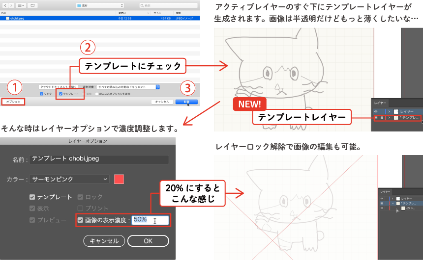 - アクティブレイヤーのすぐ下に下絵が濃度50%で配置された「テンプレートレイヤー(ロック状態)」が作成されます