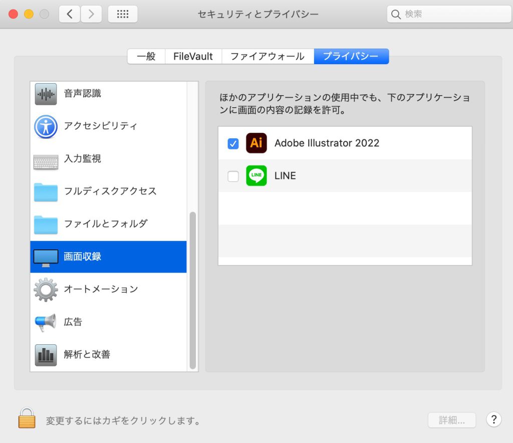 システム環境設定>セキュリティとプライバシー>画面録画 にIllustratorを追加。