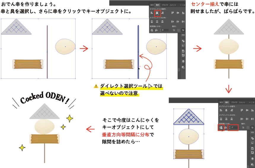 - あとは、いつもの要領で整列や分布を設定するだけ。