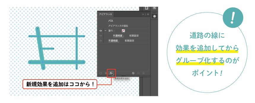 - 道路を全て選んでアピアランスパレットから新規効果を追加>パス>パスのアウトラインを選択し、それからグループ化。