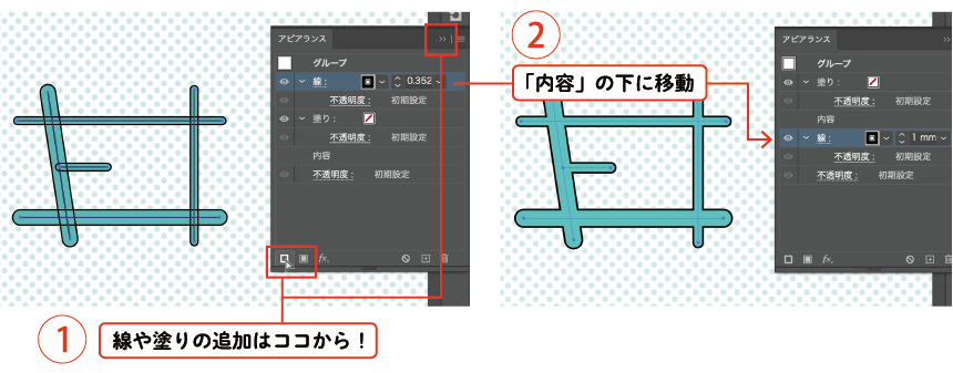 - グループを選択した状態で、アピアランスで線を追加し「内容」の下に移動させます。