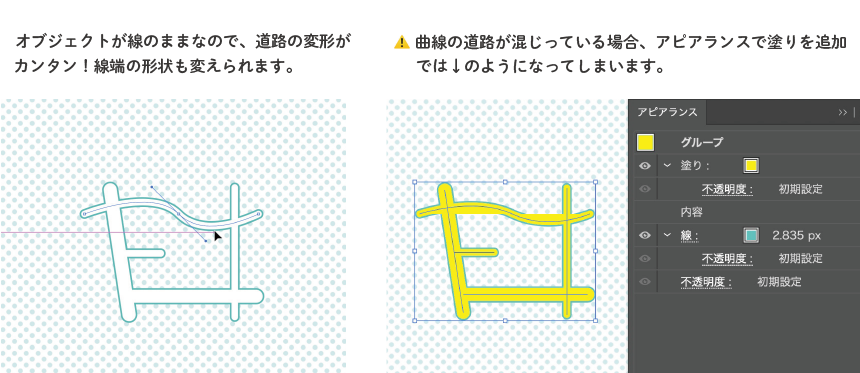 地図を作っていて、道路に縁取りしたくなることはありませんか?上で紹介した複合シェイプを使った方法もありますが、それだと道を修正したくなった時にやや面倒なことも…どれだけ修正しやすいデータを用意できるかというのも、時短のコツの一つだったりします。そこで、線とアピアランスのみを使ったもう一段階調整しやすい小技をご紹介します。