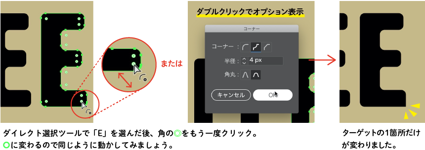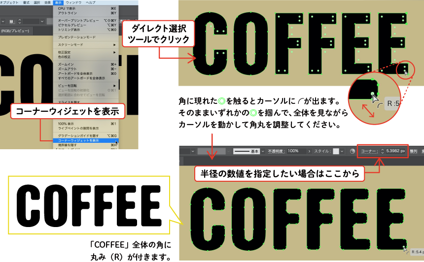 - ダイレクト選択ツールで加工したいオブジェクトを選択すると、角全てに◎が表示されます。