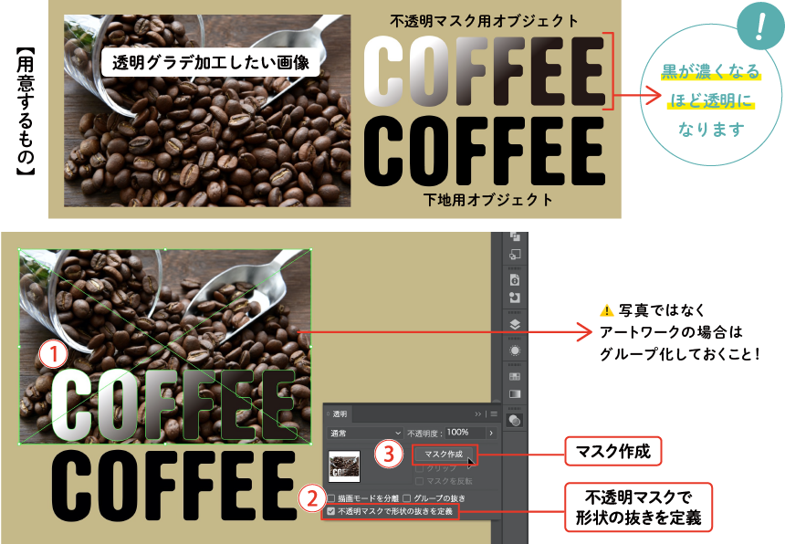 - 透明グラデーションを施したい画像やアートワーク上に不透明マスク用のオブジェクトを乗せます