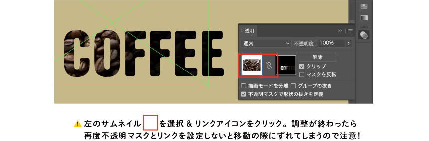 - 写真の位置を調整したい時は、2つのサムネイルの間にあるリンクを解除して、左サムネイルをクリック。調整した後はまた不透明マスクをリンクさせてください。